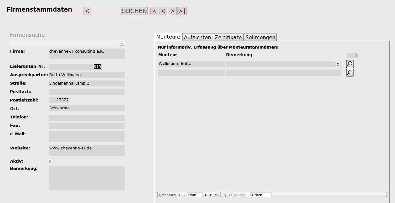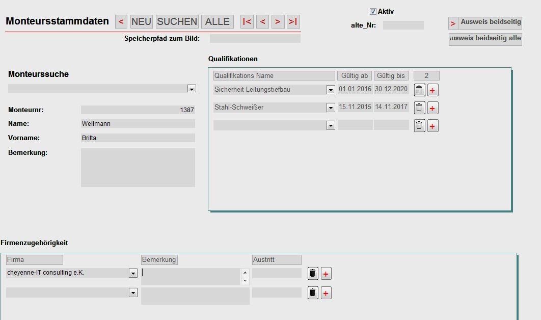 - Verwaltung von Monteursstammdaten, auch mit wechselnden Firmenzugehörigkeiten