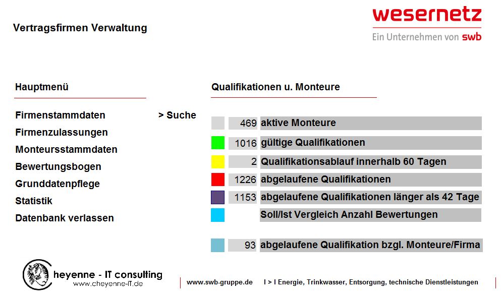 Software für Bewertungen von Tiefbaumassnahmen für den Auftraggeber swb gruppe in Bremen. Seitdem ist die Anwendung ständig weiter entwickelt worden, so dass wir mittlerweile 2 Softwareprodukte anbieten können. Die Gesamtfunktionalitäten bietet unsere Software cheyenne-Baumassnahmen, eine Light-Version zur Verwaltung von Monteuren und deren Qualifikationen bietet unser Tool cheyenne-Monteurszulassungen. Beide Produkte sind mittlerweile bei vielen Großauftraggebern und Bauunternehmen im Einsatz. Sie ist preisgünstig, so gebaut, dass auch Monteure, mit wenig EDV-Kenntnissen sie bedienen können und lässt sich in alle Windowsumgebungen integrieren.